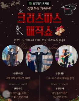광양중마도서관이 오는 12월 20일 오후 4시 어린이실에서 성탄 특집 공연 ‘크리스마스 매직쇼’를 개최한다. 공연을 맡은 ‘펀앤쇼’는 김정호 마술사가 이끄는 어린이 전문 공연팀으로, 지난 10여 년간 어