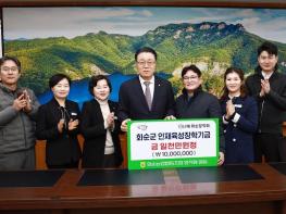 화순군은 지난 18일 화순농협 임직원들이 자발적으로 모금한 성금 1천만 원을 화순장학회에 기부했다고 밝혔다.화순농협은 2010년부터 현재까지 임직원들의 따뜻한 마음을 모아 총 1억 7천여만 원의 장학기