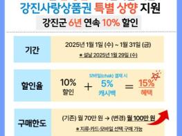 강진군이 설 명절을 맞아 1월 한 달간 강진사랑상품권 구매 한도와 모바일 상품권의 할인율을 상향 조정한다. 지원 기간은 2025년 1월 1일부터 1월 31일까지이다.이번 조치는 설 명절 기간 소비 진작과 지역