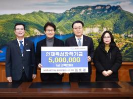 전라남도 나주시는 다도면에 위치한 해피니스컨트리클럽(주) 양진석 회장이 5일 지역인재육성기금 2천만원을 (재)나주교육진흥재단에 기탁했다고 밝혔다. 양진석 회장은 지난해에도 인재육성기금 2천만원을
