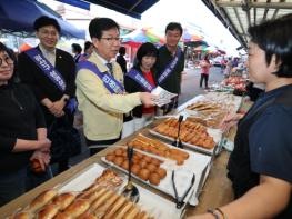 박병규 광산구청장과 광산구 공직자들이 1일 송정매일시장에서 추석 맞이 명절 장보기 행사를 진행했다.박병규 청장은 이날 전통시장 이용 분위기 확산과 지역상권 활성화를 위해 전통시장 상인들을 격려하