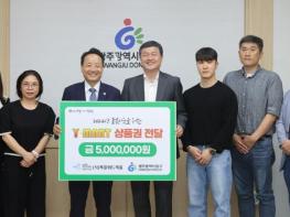 광주 동구는 22일 와이마트 부설 사단법인 피플위드피플(이사장 김성진)에서 구청을 방문해 돌봄 이웃 지원을 위한 와이마트 상품권 5백만 원을 전달했다고 밝혔다.이날 행사에는 김성진 이사장이 나병수 피