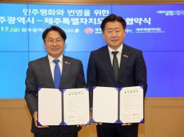 광주와 제주가 민주평화와 교류 증진을 위해 손을 잡았다.광주광역시와 제주특별자치도는 17일 오후 광주시청에서 강기정 시장과 오영훈 지사가 참석한 가운데 인권 평화와 번영을 위한 ‘상생발전 업무협약