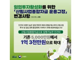 산림청은 산림사업종합자금으로 집행 가능한 인건비 한도 확대 등의 내용을 담은 '산림사업종합자금 운용 규정'이 11월 15일부터 시행된다고 밝혔다. 이번 개정·시행된 '산림사업종합자금 운용규정'의 주요