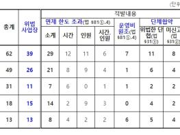 고용노동부는 ‘근로시간면제제도 운영 및 운영비원조 기획 근로감독(9.18.~11.30.)’ 중간결과(10.13. 기준)를 발표했다. 점검 사업장 62개소 중 39개소에서 위법사항을 적발했는데, 근로시간면제 한도
