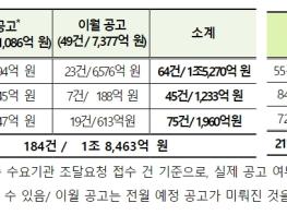 조달청은 ‘국지도 28호선 미로~하장 도로건설공사’를 포함한 10월 한 달 동안 총 184건, 1조 8,463억 원 상당의 대형사업(물품·용역 10억원, 공사 100억원 이상) 경쟁입찰 공고를 추진한다.이 가운데 신규