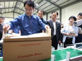 강진군이 지난 22일 장미 직거래 포장박스 반자동화 장비인 ‘제함기’ 시연회를 개최해 재배 농업인들로부터 호응을 얻었다. 이날 시연회에는 강진원 강진군수를 비롯해 강진군 농업기술센터 관계 공무원,