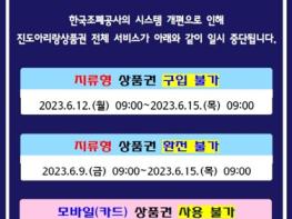 진도군이 발행한 진도아리랑상품권이 오는 12일 0시부터 15일 오전 9시까지 사용이 일시 중단된다.서비스 중단 기간 동안 지류형 상품권은 구입과 환전이 불가하고, 환전은 9일부터 중단된다.또한 모바일 상