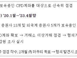 금융위원회?금융감독원?한국거래소는 약 3,400개 CFD계좌를 대상으로 주가조작 등 불공정거래 연계 여부에 대한 집중점검에 착수한다고 밝혔다. 금융위(자본시장조사과)는 지난 4월 중순 “주가조작 사태”
