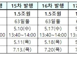 기획재정부는 원활한 재정집행을 지원하기 위해 5월 중 총 7.5조원 규모의 재정증권(63일물)을 5회에 걸쳐 발행할 계획이다. 정부는 세입과 세출간 시기가 불일치하여 발생하는 일시적인 자금부족을 메우기