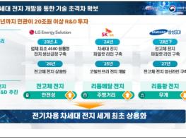 전고체 전지 세계 최초 상용화를 목표로 민?관이 ’30년까지 20조원을 함께 투자한다. 향후 5년간 이차전지 양극재의 국내 생산 능력을 4배, 장비 수출액을 3배 이상 확대하는 등 소부장의 경쟁력도 강화한