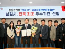 남원시가 행정안전부 주관 ‘2025년 지역교통안전환경개선’ 평가에서 전국 우수 지자체로 선정되어 행정안전부 장관 표창을 수상했다.이번 평가는 행정안전부가 전국 지자체를 대상으로 교통안전 인프라 개
