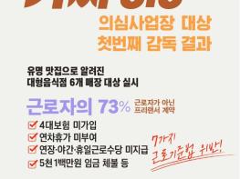 가짜 3.3 의심사업장 대상 첫번째 감독 결과- 유명 맛집으로 알려진 대형음식점 6개 매장 대상 실시· 근로자의 73% 근로자가 아닌 프리랜서 계약- 4대보험 미가입- 연차휴가 미부여- 연장·야간·휴일근로수당
