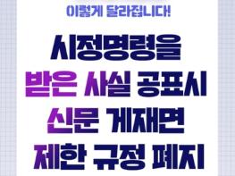 ■ 시정명령을 받은 사실 공표시 신문 게재면 제한 규정 폐지- 시행일: 2026년 상반기· 주요내용방미통위로부터 시정명령을 받은 사실을 신문에 공표할 때 게재면을 제한하던 규정을 폐지* 국민의 주된 뉴스