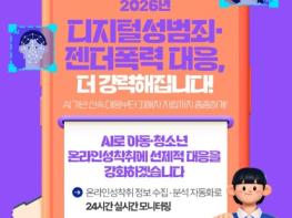 2026년 디지털성범죄·젠더폭력 대응, 더 강력해집니다!AI 기반 신속 대응부터 피해자 자립까지 촘촘하게!■ AI로 아동·청소년 온라인성착취에 선제적 대응을 강화하겠습니다.→ 온라인 성착취 정보 수집·분