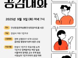 안성시는 오는 9월 9일 오후 7시 안성맞춤문화살롱(안성맞춤아트홀 4층)에서 '안성시 1인가구 공감대화'를 개최한다. 이번 행사는 1인가구 시민의 생활 경험을 공유하고 정책 제안을 청취하여, 실효성 있는