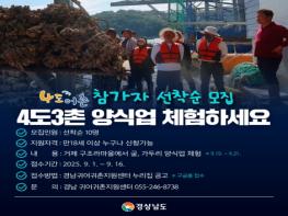 경남도는 오는 9월 19일부터 21일까지 3일간 거제 구조라마을에서 2025년 경남도 4도3촌 어촌체험 ‘나도 어촌’의 세번째 프로그램인 ‘양식업 체험’을 운영한다고 밝혔다.지난 6월 ‘어선어업 체험’, 7