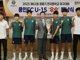 용인특례시는 28일 저녁 용인미르스타디움 내 용인시시민프로축구단 회의실에서 ‘제62회 청룡기 전국중학교 축구대회’ 우승을 차지한 용인시축구센터 U-15 선수단의 우승컵 봉납식을 개최했다고 29일 밝혔