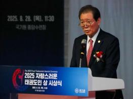 국기원이 ‘2025 자랑스러운 태권도인 상 시상식’을 성황리에 개최했다.시상식은 8월 28일 오전 11시 30분부터 국기원 중앙수련장에서 전갑길 이사장, 이동섭 원장, 이승완 원로평의회 의장 등 국기원 임직