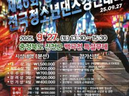 충북 진천군 (재)생거진천문화재단은 오는 9월 27일 제46회 생거진천 문화축제를 맞아‘전국 청소년 댄스 경연대회’를 백곡천 메인 무대에서 개최한다고 27일 밝혔다.이번 행사는 (재)생거진천문화재단 주