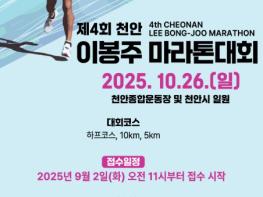 천안시체육회는 ‘제4회 천안이봉주마라톤대회’ 참가자를 다음 달 2일부터 선착순 모집한다고 25일 밝혔다. 천안시체육회가 주최·주관하고 천안시가 후원하는 이번 대회는 오는 10월 26일 천안종합운동장