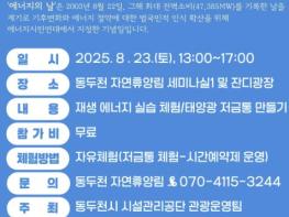 동두천시 시설관리공단 자연휴양림은 ‘에너지의 날’을 맞아 오는 8월 23일 재생에너지 체험 행사를 개최한다.‘에너지의 날’은 2003년 8월 22일, 역대 최대 전력소비(47,385MW)를 기록한 것을 계기로 기