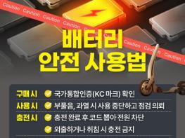 ■ 배터리 안전 사용법(구매 시) 국가통합인증(KC 마크) 확인.(사용 시) 부풀음, 과열 시 사용 중단하고 점검 의뢰.(충전 시) 충전 완료 후 코드 뽑아 전원 차단. 외출하거나 취침 시 충전 금지.(보관 시)
