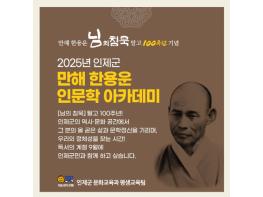 인제군은 만해 한용운의 시집 '님의 침묵' 탈고 100주년을 기념해 ‘2025년 만해 한용운 인문학 아카데미’를 운영하며, 수강생을 모집한다고 밝혔다.한해 한용운은 3‧1운동 당시 민족대표로 참여했으며, 1
