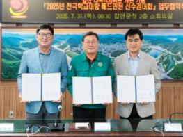 합천군은 7월 31일 목요일 오전 9시 30분, 군청 2층 소회의실에서 한국초등배드민턴연맹(회장 이용국), 경남배드민턴협회(회장 이만기)와 ‘2025 전국학교대항 배드민턴 선수권대회(초등)’ 유치 협약을 체