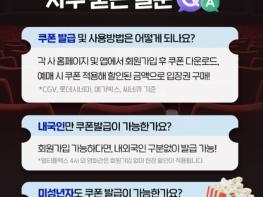 Q. 쿠폰 발급 및 사용방법은 어떻게 되나요?A. 각 사 홈페이지 및 앱에서 회원가입 후 쿠폰 다운로드, 예매 시 쿠폰 적용해 할인된 금액으로 입장권 구매!*CGV, 롯데시네마, 메가박스, 씨네큐 기준.Q. 내국