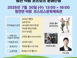 충북 괴산군은 7월 문화가 있는 날 주간을 맞아 ‘구석구석 문화배달 '우리동네 문화난장'’ 5회차 행사를 청천면 덕평 코스모스문화체육관에서 개최한다고 25일 밝혔다.오는 7월 30일 오후 1시부터 열리는