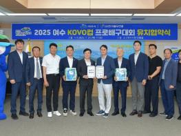 여수시는 지난 24일 시청 상황실에서 한국배구연맹(KOVO)과 ‘2025 여수 코보(KOVO)컵 프로배구대회’ 유치 협약을 체결했다.이날 협약식에는 정기명 여수시장과 신무철 한국배구연맹 사무총장을 비롯한 관