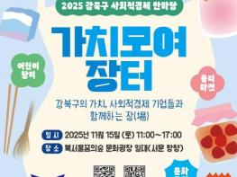 서울 강북구는 오는 11월 15일 오전 11시부터 오후 5시까지 북서울꿈의숲 문화광장(월계로 173, 서문방향)에서 2025 강북구 사회적경제 한마당 ‘가치모여 장터’를 개최한다.사회적경제의 가치 확산과 지역
