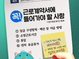 체크! 알바·취업에 성공하셨다면, 잊지말고 확인하세요!■ 근로계약서에 꼭! 들어가야 할 사항*근로기준법 제17조 제2항① 임금 구성항목·계산 및 지급 방법② 소정근로시간③ 휴일④ 연차 유급휴가- 작성