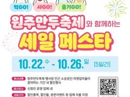 원주시는 지역 대표 축제인 원주만두축제와 연계해 구도심 상권을 활성화하기 위해 오는 22일부터 26일까지 5일간 ‘원주만두축제와 함께하는 세일 페스타’를 개최한다.이번 세일 페스타에는 만두축제 행사