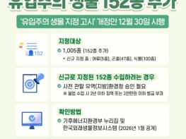 생태계 피해 사전 예방!유입주의 생물 152종 추가- '유입주의 생물 지정 고시' 개정안 12월 30일 시행■ 지정대상- 1,005종 (152종 추가)· 신규 지정 종: 어류(5종), 곤충(47종), 식물(100종)■ 신규로 지정