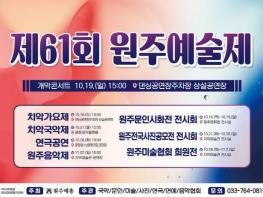 (사)원주예총은 오는 10월 16일부터 11월 2일까지 원주시 댄싱공연장 주차장 상설공연장과 치악예술관 전시실 등 원주 전역에서 시민과 함께하는 ‘제61회 원주예술제’를 개최한다.올해로 61회를 맞이한 원