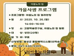 홍성군 고암이응노생가기념관은 오는 26일 오후 2시부터 4시까지, ‘가을사생 프로그램’을 운영한다고 밝혔다.이번 프로그램은 가을 정취가 무르익은 이응노의 집 주변 풍경을 배경으로, 참가자들이 직접