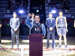 이재준 수원특례시장이 4일 수원KT소닉붐아레나에서 열린 ‘2025-2026 프로농구 KBL 홈 개막전’에서 개막선언을 했다. 수원KT소닉붐과 부산KCC의 홈 개막전에서 축사를 한 이재준 시장은 “시민과 함께 수