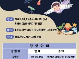 칠곡군립도서관은 한국도서관협회와 10월의 하늘 준비위원회가 공동 주최하는『10월의 하늘: 과학자들의 재능기부 도서관 과학 강연』공모사업에 선정되어 오는 25일 오후 2시에 강연을 개최한다.올해로 16