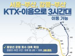 12월 30일부터서울~부산, 강릉~부산 KTX-이음으로 3시간대 이동 가능■ 중앙선 운행 횟수 대폭 확대청량리~부전 구간: 하루 총 6회→18회, 3배 증편■ 동해선 부전(부산)~강릉 운행 소요시간3시간 54분으로,