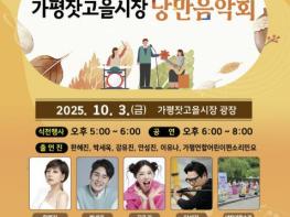 가평군은 오는 10월 3일 가평잣고을시장 특설무대에서 ‘2025 가평잣고을시장 낭만음악회’를 개최한다고 밝혔다.이번 음악회는 지역 상권 활성화와 주민 화합을 위해 마련된 행사로, 전통시장 방문객들에게