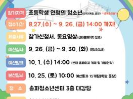 서울 송파구가 가을날 청소년들의 감수성을 채워줄 아동·청소년 음악축제를 10월 25일 송파청소년센터 대강당에서 개최하고, 참가팀을 모집한다고 알렸다.구는 축제 당일 초등학생과 중고등학생을 대상으로