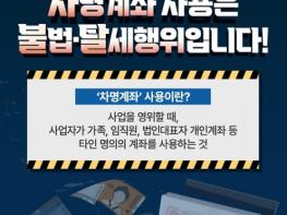 ■ '차명계좌' 사용이란?사업을 영위할 때, 사업자가 가족, 임직원, 법인대표자 개인계좌 등 타인 명의의 계좌를 사용하는 것■ 차명계좌 사용 신고방법차명계좌 사용자의 인적사항·계좌번호·차명계좌 거래