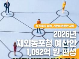 2026년 재외동포청 예산안 1,092억 원 편성- 해외 동포청년, 대한민국 발전의 전략적 동반자로 육성- 동포정책 컨트롤타워 기능 강화- 한인 정체성 함양 및 디지털 행정 기반 강화회복과 성장을 위한 2026