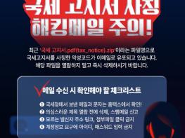 ■ 국세 고지서 사칭 해킹메일 주의!최근 '국세 고지서.pdf(tax_notice).zip'이라는 파일명으로 국세고지서를 사칭한 악성코드가 이메일로 유포되고 있습니다. 해당 파일을 열람하지 말고 즉시 삭제하시기
