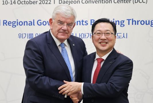 [중앙뉴스라인, 김영환기자] 이장우 대전시장 10일 오후 17시 20분 대전 UCLG 총회에 참가하기 위해 대전을 찾은 네덜란드 헤이그시 얀 반 자넨(Jan Van Zanen) 시장을 접견하고 양 도시간 교류 확대 방안을 협의했다.