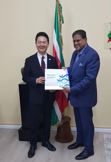 아울러, 장 기획관은 한국이 2030 부산세계박람회를 유치하여 기후변화, 디지털격차, 경제적 불평등 등 한-수리남이 안고 있는 인류 공동의 문제에 대한 해결책 및 미래 비전을 제시하고자 한다며, 동 박람회 유치를 위한 지지를 당부했다.