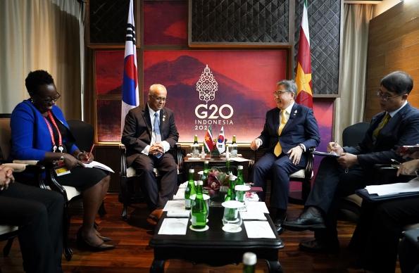 [중앙뉴스라인, 김영환기자] G20 정상회의 참석 계기 인도네시아 발리를 방문 중인 박진 외교부 장관은 11.16일 15:00경(현지 시각) '알버트 람찬드 람딘(Albert Ramchand Ramdin)' 수리남 외교장관과 회담을 갖고, ▲개발·에너지·자원·농수산 협력, ▲한국전 수리남 참전 용사에 대한 보훈, ▲지역 및 한반도 정세 등 현안에 대하여 논의했다.