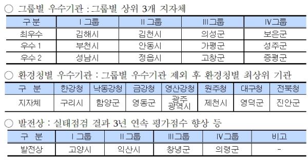 그룹별 최우수 지자체 4곳은 김해시, 김천시, 의성군, 보은군이며, 우수 지자체 8곳은 부천시, 안동시, 가평군, 성주군, 성남시, 정읍시, 고창군, 증평군이다.